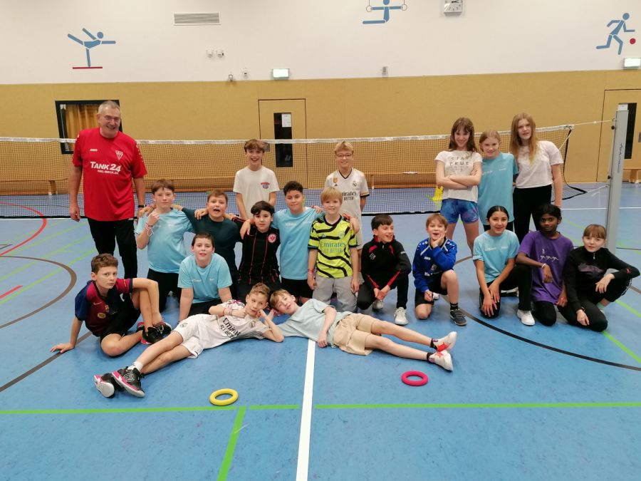 Die aktuelle 5. Sportklasse mit Klassenlehrer Herrn Wolf spielten unter der Leitung von Ulrich Bick von der TG Groß Karben Ringtennis. Bereits Mitte der zwanziger Jahre brachte der Bürgermeister von Karlsruhe, Hermann Schneider, das Schiffsspiel Deck-Tennis von einer Seereise nach New York mit nach Deutschland. Vereinfacht ausgedrückt spielt man mit einem Gummiring Tennis über ein Badmintonnetz. Mit großer Begeisterung probierte die Sportklasse nach den Herbstferien diese Sportart für 6 Wochen aus. Dabei lernten sie die richtige Wurf- und Fangtechnik des Ringes und auch taktisches Denken, damit der Ring vom Gegner nicht gefangen werden kann.