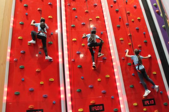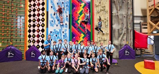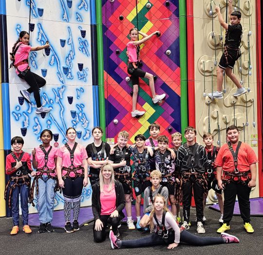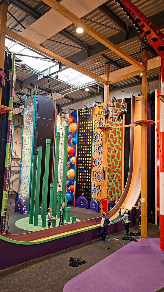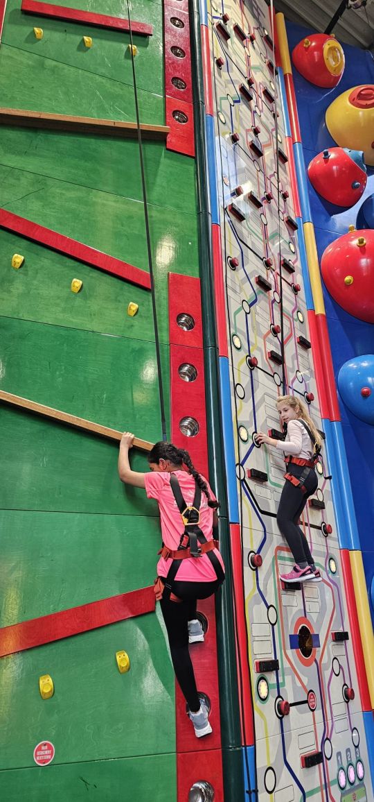 Einen Vormittag lang hatten die Schülerinnen und Schüler der 5. und 6. Sportklasse die Anlage ganz für sich und konnten rund 50 vertikale Parcours ausprobieren. Griffe, Löcher, Haken und bewegliche Elemente sorgten für spannende Kletterrouten – begleitet von blinkenden Lichtern und spielerischen Effekten. Besonders beliebt waren der Hochseilgarten und ein Sprungturm.