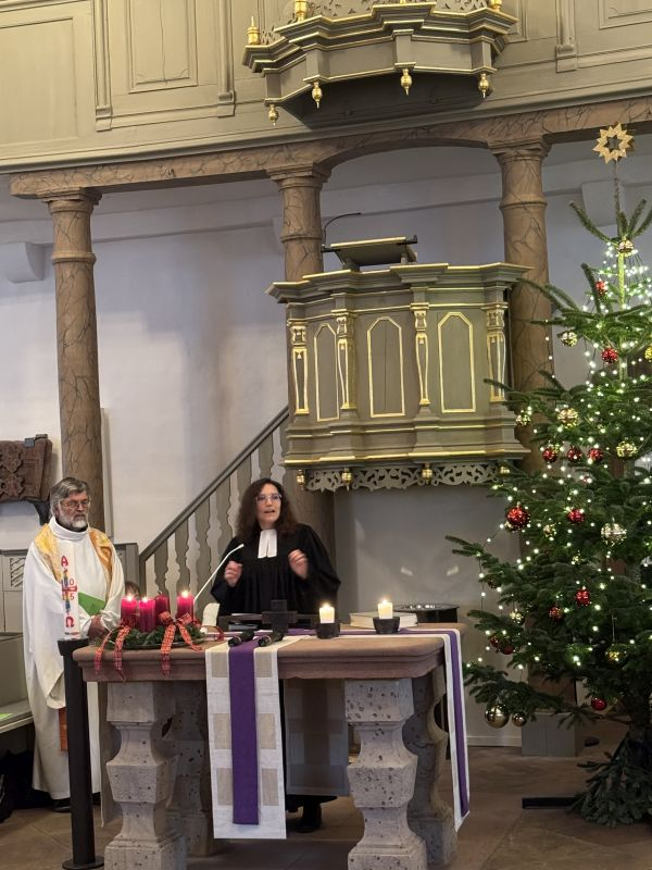 Am letzten Schultag vor den Weihnachtsferien 2025 gingen die Klassen 5 bis 10 wie jedes Jahr gemeinsam mit ihren Klassenlehrkräften in die evangelische Kirche zum Weihnachtsgottesdienst. Der Gottesdienst wurde in den Schulwochen davor von den Religionslehrerinnen Frau Loginow, Frau Ranft, Frau Röhrig, Frau Zimmermann-Keseberg und Frau Schneegold vorbereitet. Der Gottesdienst wurde von der evangelischen Pfarrerin Dr. Vetter und dem katholischen Pfarrer Richard aus Ilbenstadt geleitet. Musikalisch begleitet wurden die Schülerinnen und Schüler von den Honey Twins (Renate Gantz- Bopp – Vocals und Gerry Reutzel – Piano). Der Chor der Klassen 5a und 5b (unter der Leitung von Frau Schneider und Frau Stang) steuerte die Lieder "Ich wünsch mir einen Regenbogen" und "Fröhliche Weihnacht" zum Gottesdienst bei.
